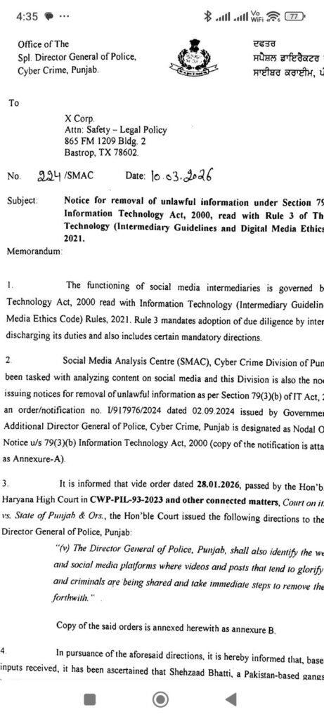 Punjab Police’s Social Media Analysis Centre (SMAC), operating under the Cyber Crime Division, was tasked with acting on this direction. It began scanning platforms and sending notices to social media intermediaries — including X — for removal of content it identified as falling within the scope of the court’s order.